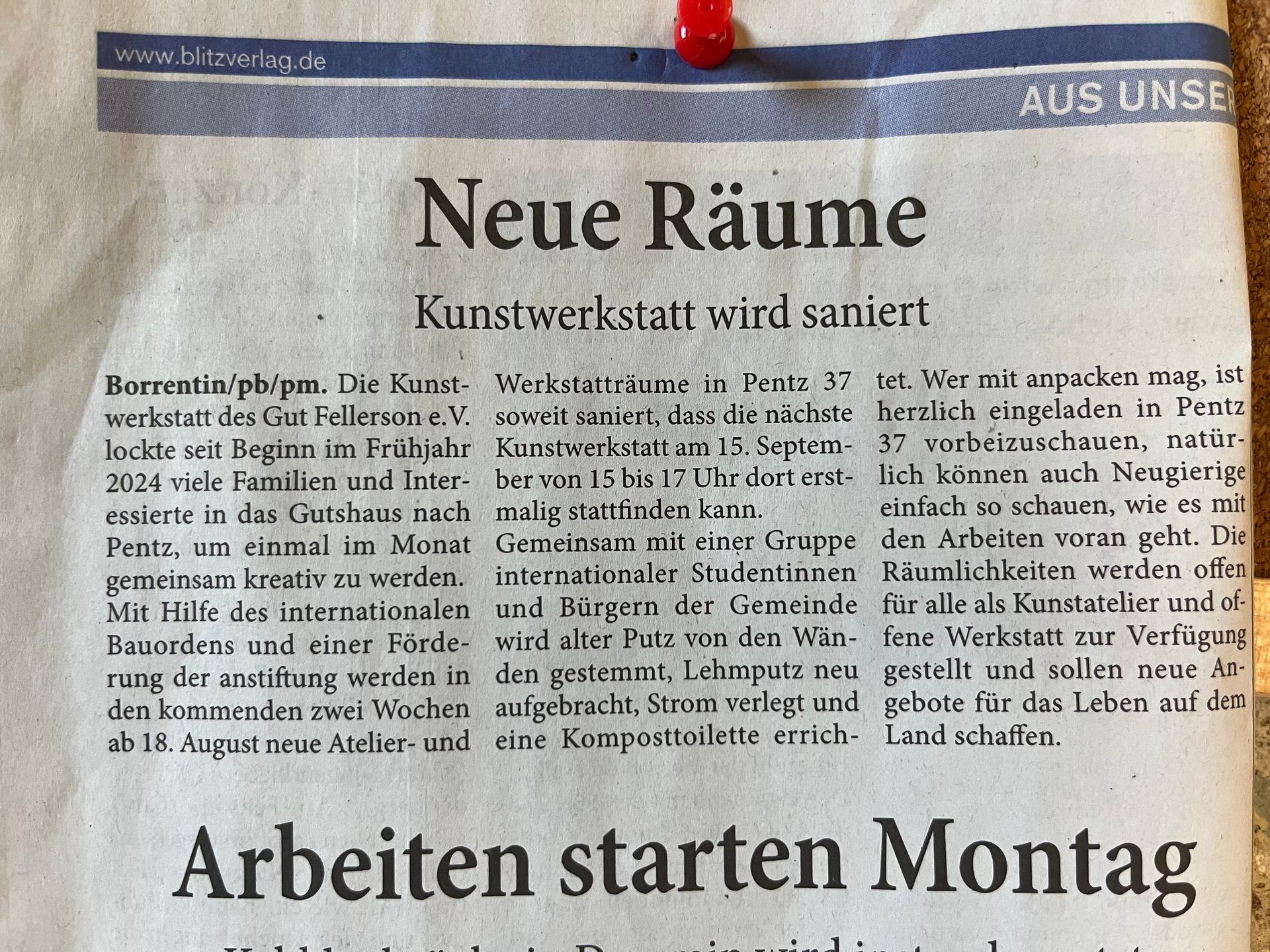 Sehr unvollkommen und sanierungsbedürftig sind die Räumlichkeiten der baldigen Werkstatt des Gut Fellerson e.V. aktuell noch. Den kreativen Geist lassen 3 Frauen einer Familie dennoch einziehen und zeigen Skizzen, Ölmalereien und Drucke. Kreative Besucher werden an den Ateliertisch eingeladen und können verschiedene Techniken ausprobieren. Zu Pfingsten 08.-09.06. von 11-17 Uhr in Pentz 37, 17111 Borrentin.